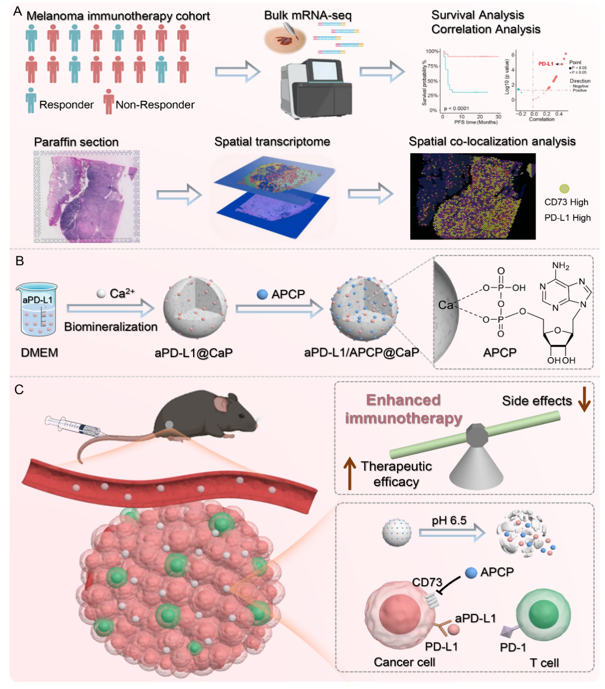 近期,我院周文虎教授团队与成人文学 湘雅医院陈翔教授团队联合在国际知名期刊《Advanced Science》(IF=14.3)上发表了题为“Co-Delivery of aPD-L1 and CD73 Inhibitor Using Calciu…