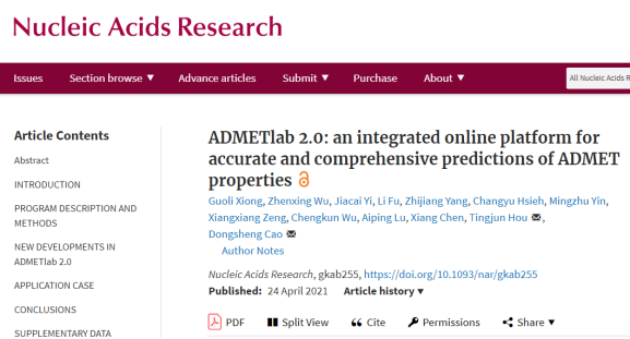 近日,我院曹东升教授团队与浙江大学侯廷军教授团队合作,在国际权威期刊Nucleic Acids Research(IF=11.504)上发表题为“ADMETlab 2.0: an integrated online platform for accurat…