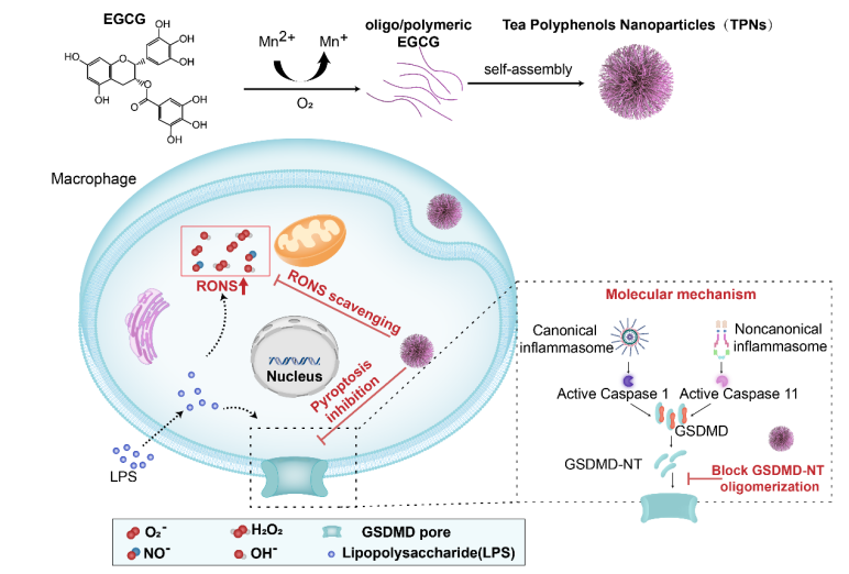 周文虎教授与湘雅三医院吕奔-赵锴教授团队合作,在纳米材料学领域权威期刊《ACS Nano》(IF=15.881, NI指数期刊)上发表了题为“Intrinsic Radical Species Scavenging Activities of Tea Polyphenols Nanoparticles Blocks Pyroptosis in Endotoxin-Induced Sepsis”的最新原创性研究成果。该研究利用金属离子催化下的表没食子儿茶素没食子酸酯(Epigallocatechin gallate, EGCG)氧化自聚,构建一种新型多功能纳米材料。该纳米材料可通过清除活性氮氧自由基和抗细胞焦亡两条途径,实现对脓毒症的治疗。