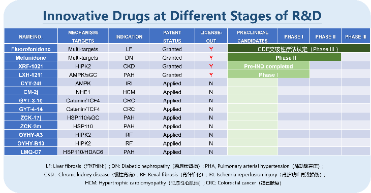 团队依托基础研究的持续创新,在新药研发领域取得一系列具有代表性的成果,目前已有四项1类新药进入不同研发阶段:氟非尼酮(抗肝纤维化)获突破性疗法认定并进入临床III期;美氟尼酮(抗糖尿病肾病)进入临床II期;LXH-1211(抗肺动脉高压)进入临床I期;XRF-1021(抗慢性肾病)具有“抗炎+抗纤维化”双重机制,药效强、毒性低,入选芙蓉实验室2023年度十大科技进展及长沙市十大科技成果转化项目。多项后续候选化合物亦展现出良好的研究价值与开发前景。