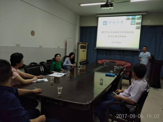 9月6日晚上7:00,我院药剂学教研室在孝骞楼626办公室举行了2017学年秋季学期本科生理论课预讲活动。刘珍宝老师、周文虎老师参与了本次本科生理论授课预讲,授课内容分别为《溶液的形成理论》、《固体分散体的制备技术》。本次活动由药剂学系主任丁劲松教授主持,系副主任陈传品教授、姚瑶副教授,柳文洁老师,吴建平老师,贺凌云老师及教学秘书袁玉老师到场指导。
