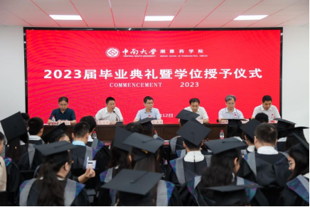 2023届毕业典礼暨学位授予仪式在药学楼四楼报告厅举行,仪式由学院党委副书记王昊主持。院领导龚涛、刘昭前、曾文彬、胡长平、李乾斌,教师代表及全体毕业生参加了仪式。