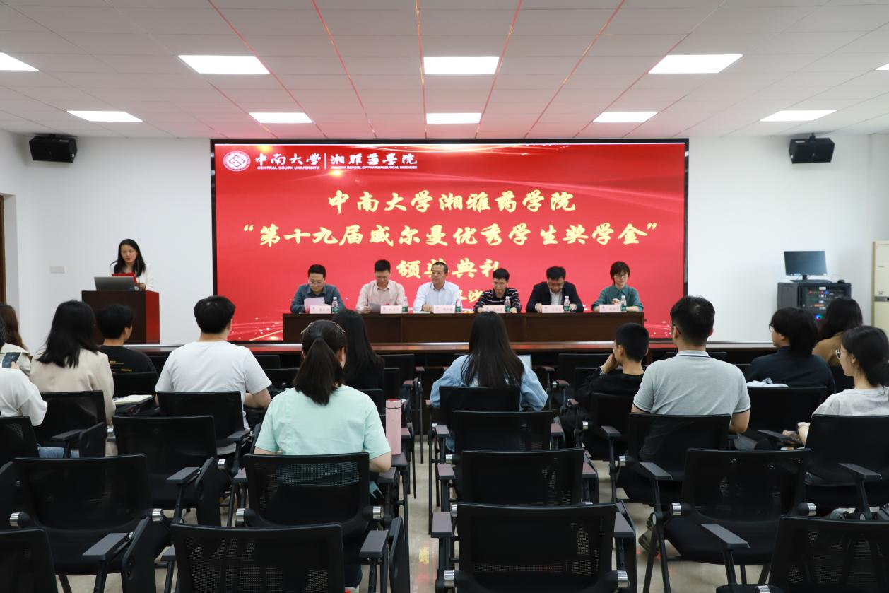 在药学大楼四楼报告厅举办了第十九届“威尔曼优秀学生奖学金”颁奖典礼。典礼由学工办主任桂玲智主持,湘北威尔曼制药股份有限公司、广州分公司研发总监付四海博士、医学信息主管魏康竞、湖南省药物安评中心主任姜德建研究员、学院党委书记胡平安、副院长(主持行政工作)阳国平、副院长曹东升出席,成人文学