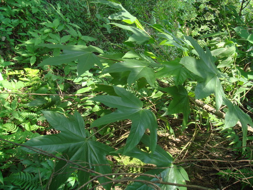 刺楸Kalopanax septemlobus (Thunb.) Koidz.五加科刺楸属,落叶乔木,小枝具粗刺。叶坚纸质,掌状5-7裂,近圆形,基部截形至心脏形,边缘具细锯齿,上面深绿色,无毛,下面淡绿色,仅脉上具淡棕色软毛。伞形花序排列成顶生的复圆锥花序,花白色或淡黄绿色;萼微具5齿裂;花瓣5,三角状卵圆形,雄蕊5,内曲。以根、根皮、树皮入药,有祛风利湿、活血止痛之效,用于风湿腰膝酸痛,肾炎水肿,跌打损伤,内痔便血。