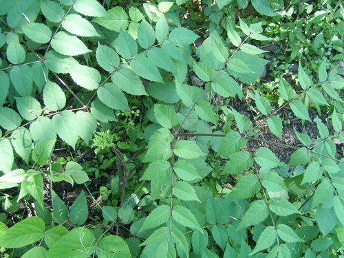 楤木AraliachinensisL. 五加科楤木属,小乔木或灌木。树皮灰色,疏生粗壮直刺。小枝被黄棕色绒毛,疏生短刺。叶为2~3回羽状复叶,边缘具细锯齿或不整齐的重锯齿。托叶与叶柄基部合生,耳廓形。叶轴无刺或有细刺。花白色,芳香,花序伞形,后组成大型的圆锥花序。以根皮和茎皮入药,有祛风除湿,利尿消肿,活血止痛之效。用于肝炎,淋巴结肿大,肾炎水肿,糖尿病,白带,胃痛,风湿关节痛,腰腿痛,跌打损伤。
