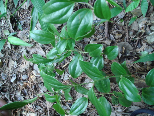 抱茎菝葜Smilax ocreata A. DC. 百合科菝葜属,攀援灌木,叶柄鞘状抱茎。根茎入药,有清热利湿之效,可治风湿痹痛,尤宜于湿热症者。
