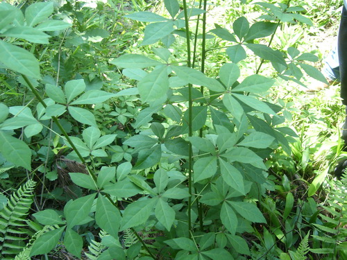 五加Acanthopanax gracilistylus W. W. Smith ,五加科五加属。灌木,有时蔓生状,枝无刺或在叶柄基部有刺,掌状复叶互生,叶缘有锯齿,两面无毛,或叶脉有稀刺毛。伞形花序单生于叶腋或短枝的顶端,花瓣5,黄绿色;根皮入药,有祛风湿;补肝肾;强筋骨;活血脉之效。用于风寒湿痹;腰膝疼痛;筋骨痿软;小儿行迟;体虚赢弱;跌打损伤;骨折;水肿;脚气;阴下湿痒。
