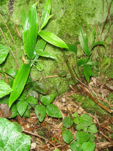 宝铎草Disporum sessile D. Don 又名淡竹花.百合科万寿竹属 多年生草本。茎光滑少分枝。叶顶端尖或渐尖,通常歪斜;叶柄极短或无柄。花黄色、绿黄色或白色,筒状,1~3(5)朵顶生;无花序梗;根入药,益气补肾、润肺止咳。