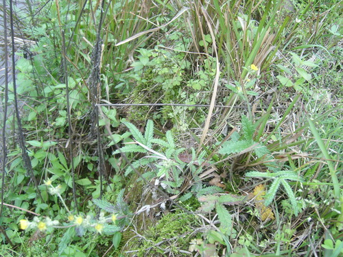 翻白草 也叫鸡腿根。蔷薇科委陵菜属。多年生草本,根多分枝,下端肥厚成纺锤状。茎上升向外倾斜,多分枝,表面具白色卷绒毛。基生叶丛生,单数羽状复叶,小叶5~9:茎生叶小,为三出复叶,顶端叶近无柄,小叶边缘具锯齿,上面稍有柔毛,下面密被白色绵毛;花黄色,聚伞状排列;萼绿色,宿存。全草带根入药,有清热,解毒,止痢止血之效。可治妇女赤白带和月经过多症。经监床验证,本品对糖尿病有治疗功效。