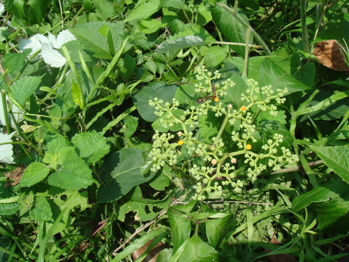 大叶乌蔹莓Cayratia oligocarpa Gagnep. 葡萄科乌蔹莓属。落叶木质藤本卷须,顶端多分二叉,奇数羽状复叶,呈大叶乌蔹莓乌足状排列,有小叶5枚,小叶具柄,狭卵形,中间小叶明显较大。叶片先端渐尖,基部钝圆或宽楔形,缘具短尖圆钝齿,叶背密被短柔毛。两性花,腋生聚伞花序,花梗无关节被短毛。全草入药,有凉血解毒、利尿消肿的效用;根煎汁服,可治乳肿。