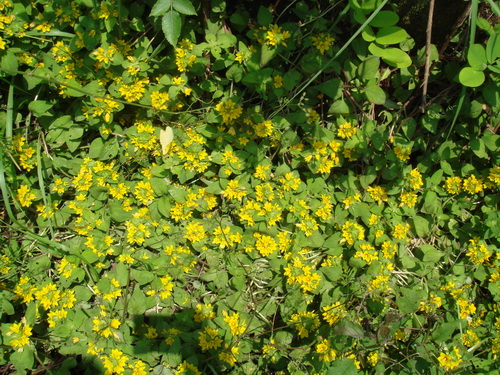 聚花过路黄Lysimachia congestiflora. 报春花科珍珠菜属。多年生草本。茎浓紫红色,具短柔毛,分枝多,下部匍匐,上部斜升。叶交互对生,枝端密集,略被短柔毛;叶片广心形,边缘有绿红色小点;花黄色,单生于枝端叶腋,成密集状。全草入药,为过路黄(民间称“金钱草)混用品。可治尿路结石,胆囊炎,胆结石,黄疸性肝炎,水肿,跌打损伤,毒蛇咬伤及毒蕈和药物中毒;外敷治火烫伤及化脓性炎症。