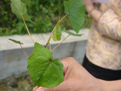千金藤叶,与金线吊乌龟是有区别的:首先,金线吊乌龟的叶是卵圆形,而此藤略呈三角形,其次在根,金线吊乌龟是块根,而此藤的根则是圆柱状。