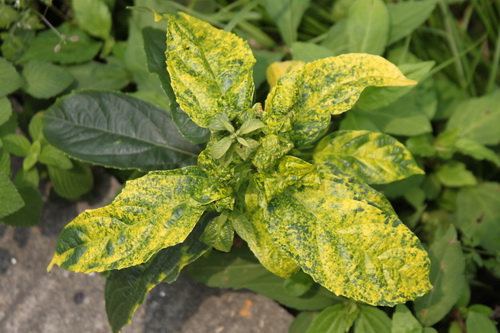 洒金珊瑚var.variegata D’Ombr.山茱萸科桃叶珊瑚属。常绿灌木,丛生,树冠球形。树皮初时绿色,平滑,后转为灰绿色。叶对生,肉革质,矩圆形,缘疏生粗齿牙,两面油绿而富光泽,叶面黄斑累累,酷似洒金。花单性,雌雄异株,为顶生圆锥花序,花紫褐色。为栽培变种观赏植物。