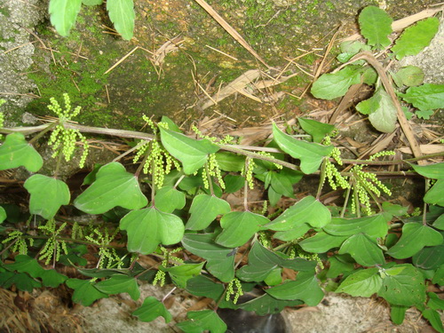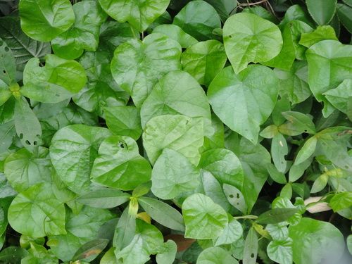 千金藤Stephania japonica (Thunb.)Miers 防己科千金藤属。木质藤本;根圆柱状,皮暗褐色,内面黄白色。小枝有细槽,老茎木质化。叶盾状着生,阔卵形,顶端钝,背面粉白色,掌状脉7—9条,花序伞状至聚伞状;总花梗长2—3厘米;花黄绿色。以根或藤茎入药,有清热解毒,利尿消肿,祛风止痛之效。用于咽喉肿痛,牙痛,胃痛,水肿,脚气,尿急尿痛,小便不利,外阴湿疹,风湿关节痛;外用治跌打损伤,毒蛇咬伤,痈肿疮疖。