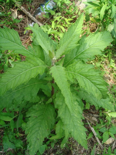 土荆芥Chenopodium ambrosioides L 又名臭草,藜科藜属。一年生或多年生草本,揉之有强烈臭气;茎直立,多分枝,具条纹,近无毛。叶互生,顶端渐尖,基部渐狭成短柄,边缘有不整齐的钝齿,上面光滑无毛,下面有黄色腺点,沿脉土稍被柔毛。花绿色,两性或部分雌性,组成腋生、分枝或不分枝的穗状花序。带果穗全草入药,有祛风除湿,杀虫,止痒之效,用于蛔虫病,钩虫病,蛲虫病,外用治皮肤湿疹,瘙痒,并杀蛆虫。