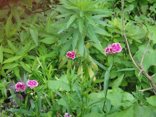 石竹Dianthus chinensis 石竹科石竹属。因其茎具节,膨大似竹,故名。为多年生草本,茎直立,有节,多分枝,叶对生,条形或线状披针形。花萼筒圆形,花单朵或数朵簇生于茎顶,形成聚伞花序,花色有紫红、大红、粉红、紫红、纯白、红色、杂色,单瓣5枚或重瓣,先端锯齿状,微具香气。全草或根入药。具清热利尿、破血通经之效。