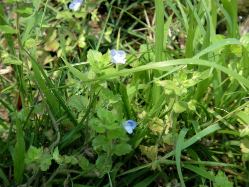 阿拉伯婆婆纳Veronica persica Poir.玄参科婆婆纳属。铺散多分枝草本,叶2-4对,具短柄,卵形或圆形,基部浅心形,边缘具钝齿,两面疏生柔毛。总状花序很长;苞片互生,与叶同形且几乎等大;花梗比苞片长,有的超过1倍;花萼有睫毛,三出脉;花冠蓝色、紫色或蓝紫色,裂片卵形至圆形,喉部疏被毛;雄蕊短于花冠。全草入药,有祛风除湿;壮腰;截疟之效。