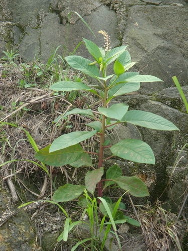 商陆Phytolacca acinosa Roxb 商陆科商陆属。多年生草本,全株无毛。直立,多分枝,绿色或紫红色,具纵沟。叶互生,椭圆形或卵状椭圆形,先端急尖,基部楔形而下延,全缘,侧脉羽状,主脉粗壮;叶柄长1.5~3厘米,上面具槽,下面半圆形。