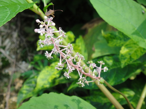 商陆花序:总状,顶生或侧生,花两性,具小梗,小梗基部有苞片1及小苞片2;萼通常5片,偶为4片,后变淡红色:无花瓣:雄蕊8,花药淡粉红色(少数成淡紫色);心皮8~10,离生。