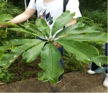 第一次见到凹叶厚朴,是在两棵超级高大的树上,树还长在“悬崖边”,老师对厚朴十分的喜爱,差点准备冒险去摘,不过还是出于安全考虑,放弃了这个想法。那就可想而知,当我们又走了一段路,看见了一个可以采摘的到的凹叶厚朴的时候我们有多兴奋!真是是要高兴的跳起来了!顺便说一下,我们的凹叶厚朴别的组的同学和老师都有点小小的羡慕哦~