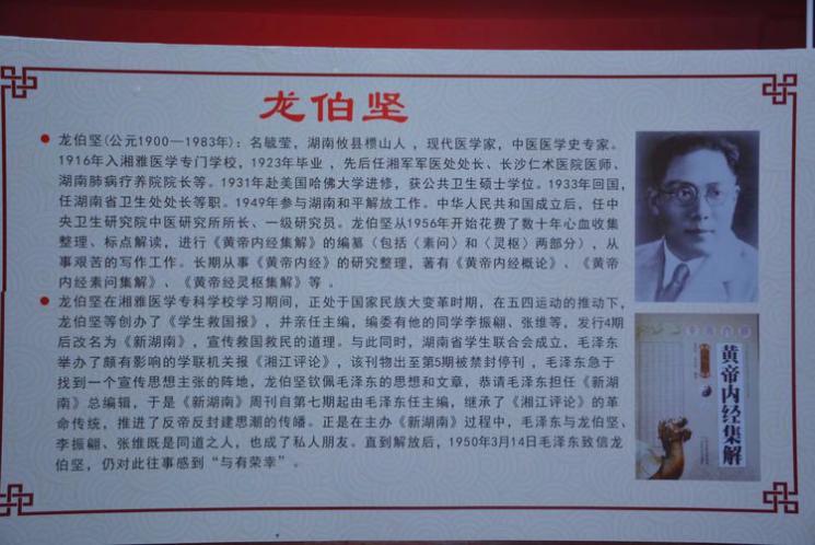 来到此地后,我们首先了解到了一位湘雅校友,龙伯坚先生。在参观后龙伯坚生平业绩陈列馆后,我们知道了先生竟是攸县本地人,曾去哈佛留学,归国后任湖南省卫生处处长等职,著有《黄帝内经概论》等。