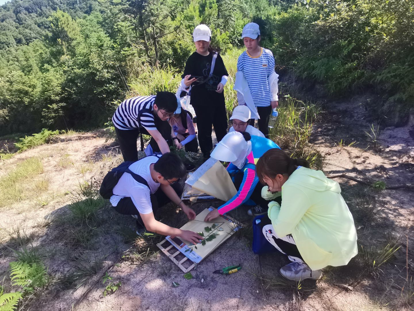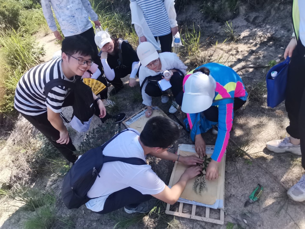 第二天的学习,充满了挑战而富有成就感,同时也伴随着师生间的交流。之所以这么说,是因为这一天我们在认识了药田中的植物后,沿着小路上山。山上的路并不好走,刚上山时的路还是用推土机挖出来的路,比较平坦,而之后路却是比较陡峭并且有很多长满尖刺的植物。因此,走山路的时候我们必须小心的避开有刺的植物。同时,在这些有刺的植物中,老师还告诉我们哪种植物是没有结果的金樱子。途中我们还遇到了被枯木挡住路的情况,还好我们用工具剪去挡路的树枝,最终成功到达了山顶,可能这也是一种“山重水复疑无路,柳暗花明又一村”。到达山顶后,我们和老师一起完成了黄荆和艾蒿标本的制作。