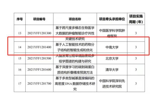 本项目由我院科研团队独立申请获批。曹东升教授的带领下,联合了我院两位青年骨干教师王文宣副教授和董界副教授获批了该青年科学家项目。本项目紧密围绕药物分子结构的智能生成和优化关键科学问题利用神经机器翻译、多目标优化、多任务及自监督学习等新型人工智能技术研究药物分子结构智能生成和优化的新理论新方法,旨在发展具有自主知识产权的高效全新药物设计算法和软件系统推动我国AI药物设计核心技术研究以及创新药物研究的发展。